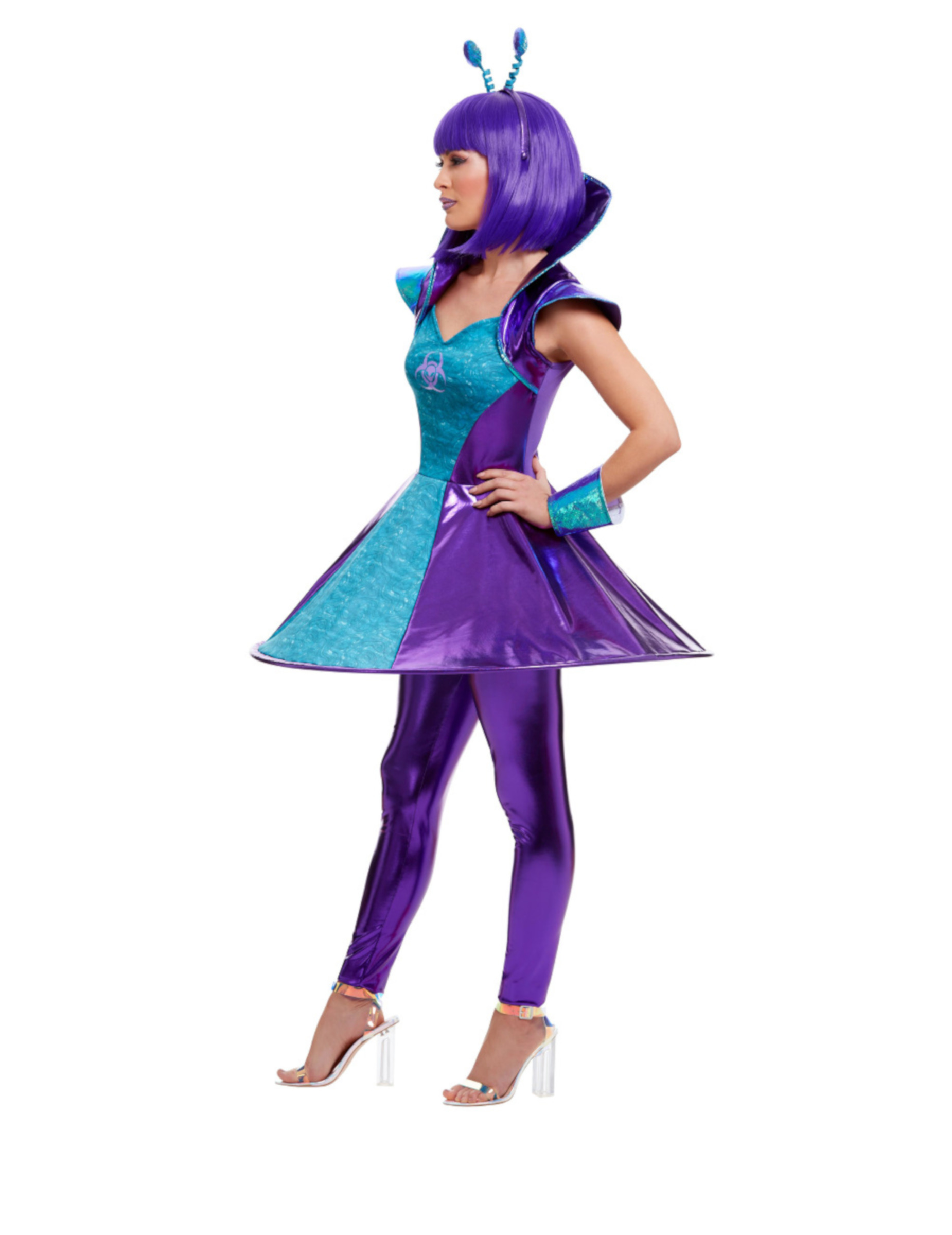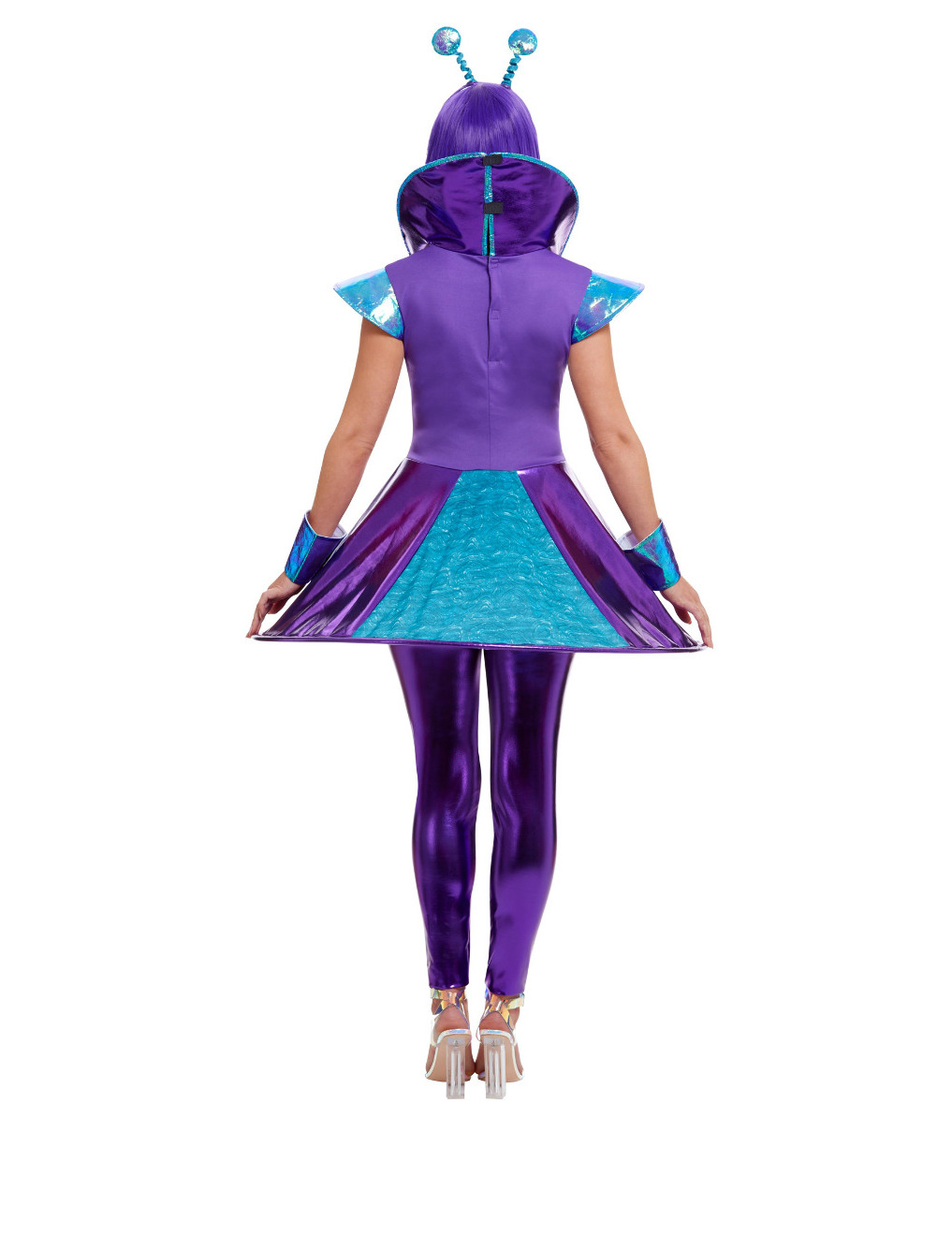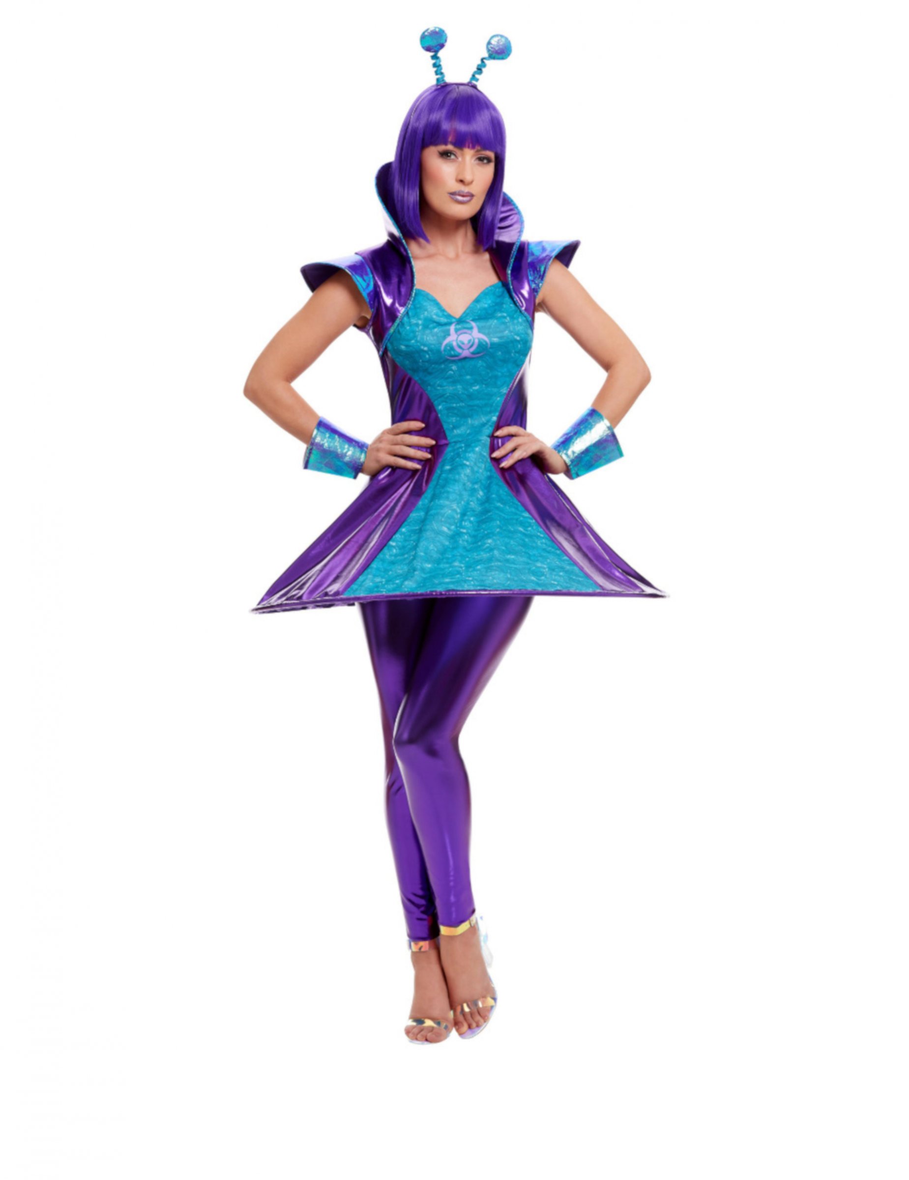Ce déguisement d’alien bleu et violet est pour femme. Il se compose d’une robe, d’un legging, d’une paire de manchettes et d’un bandeau (perruque non incluse).