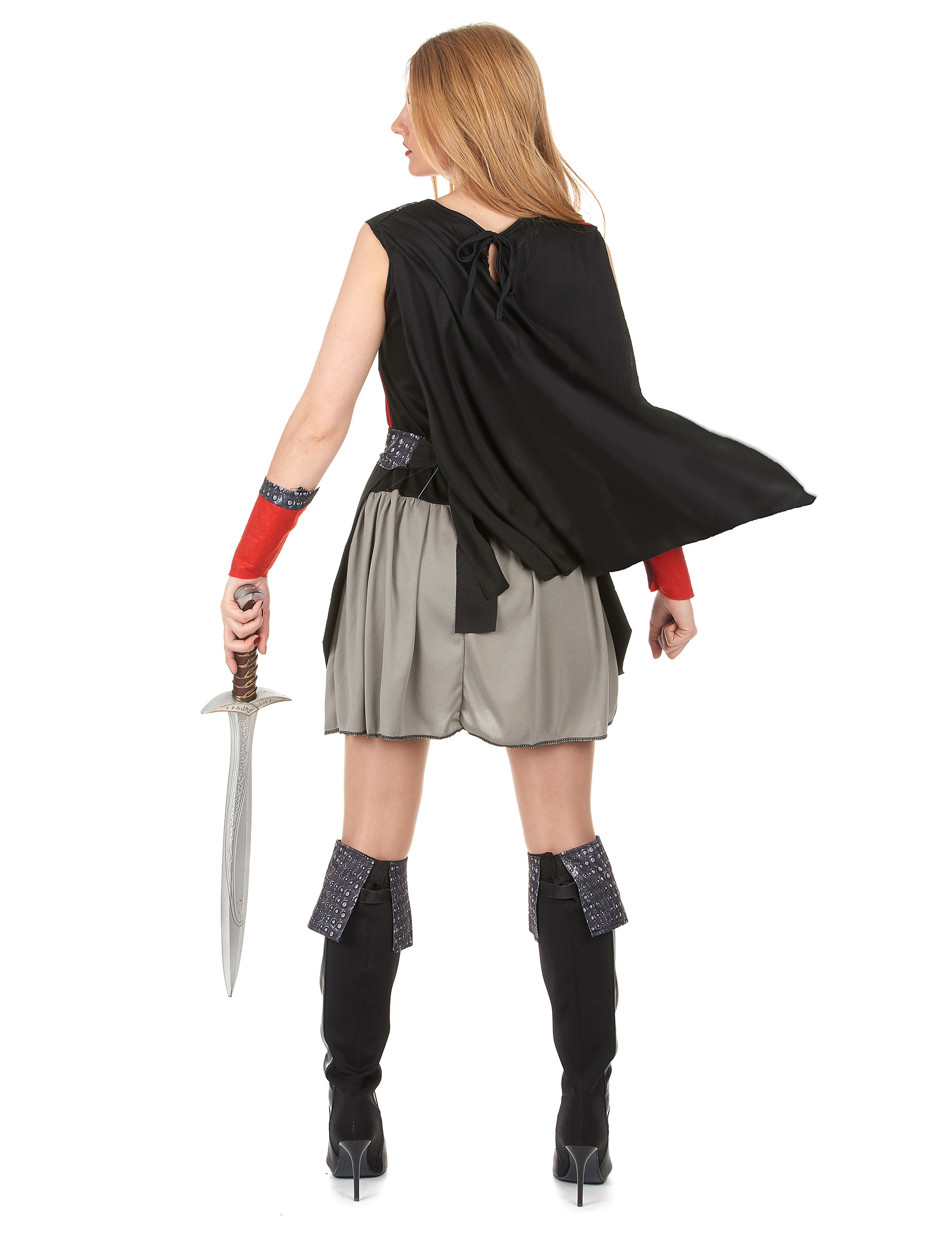 Ce déguisement de chevalier médiéval pour femme comprend une robe avec une cape, une ceinture, des manchons, des sur-bottes (chaussures non incluses).