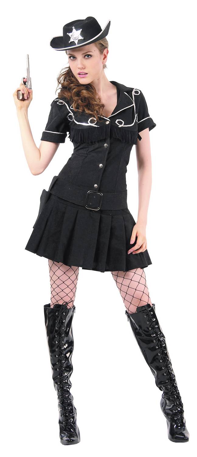 La robe est noire, dans un tissu léger et doux au toucher. La poitrine est soulignée par un liseré de sequin argenté et de franges noires. Le col et le bord des manches sont longés d’un liseré couleur argent. Le bas de la robe est plissé. La robe pourra être portée facilement grâce à des boutons pression présent sur l’avant. Un chapeau léger noir avec une étoile de shérif vient compléter l’ensemble (Pistolet, lasso et chaussures non inclus)